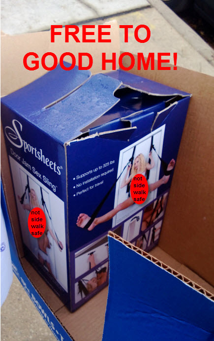 This morning I went to meet a co-worker for coffee. When I stepped outside I saw a box on our front stoop that wasn’t one of my donated items. I could tell by the graphic photo of a naked woman and man on the box. What the … ? So I walk up to it. Right there in one of my empty boxes still labeled with a giant sign reading “FREE” in my handwriting, was now a “Door Jam Sex Sling” in its original packaging.